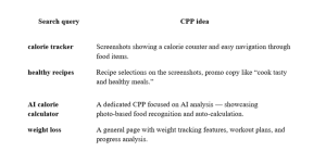 Let’s say you have a fitness app that includes a calorie tracker, recipes, and an AI-powered nutrition analyzer. Previously, Custom Product Pages were only available for ad campaigns. Now, you can group user search queries into clusters and create a dedicated page for each one: